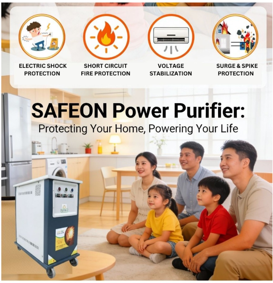 SafeOn Power Purifier delivers shock-free, fire-free, and stabilized power for your home and business — 24/7 protection, without compromise.