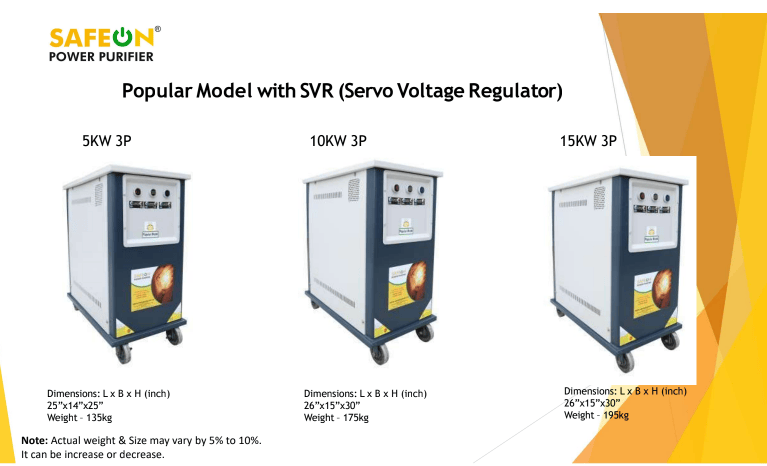 Some models (SVR - Servo Voltage Regulator and AVR - Automatic Voltage Regulator) incorporate voltage stabilization features to protect connected appliances from damage caused by voltage fluctuations.